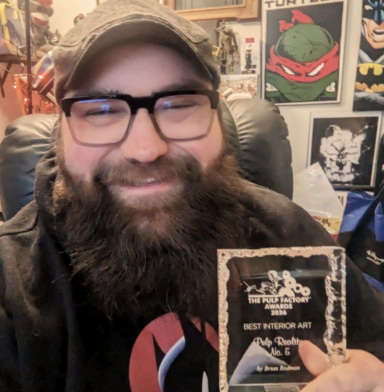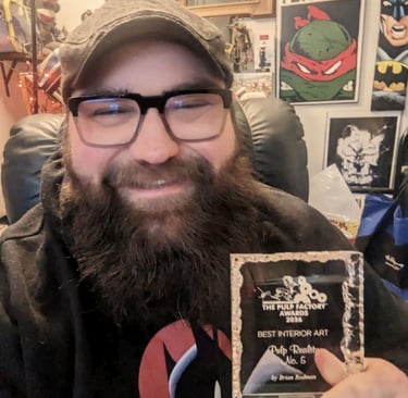 is an award-nominated author and award-winning illustrator who lives in Louisville, Kentucky, with his wife/business partner, Robyn, and their three cats, Phoebe, Beesly, and Niko. He has been creating comics and writing stories professionally since 2015. He's had prose work and illustrations published in multiple Pulp Factory Award-Winning anthologies, "Pulp Reality No.4" and "Pulp Reality No.5" from Stormgate Press. Brian also won the Pulp Factory Award for Best Interior Illustrations for his work on Pulp Reality No.5. Brian's had short comics and poems published in anthologies such as Louisville Cartoonist Society's "Tall Tales & Little Lies", "Legends: Myths & Not So True Stories", and "Sagebrush & Tumbleweeds." Brian has written/illustrated/published Memoirs of an Angel, the comic book series, and The Nebulizer comic book series; both of which have totaled eight successful and fulfilled Kickstarter campaigns from 2018 to 2023. In 2024, he successfully crowdfunded his first full-length illustrated novel, "Memoirs of an Angel: The Grey Pilgrim" (which earned him the Pulp Factory nomination for Best Pulp Novel in The Pulp Factory Awards 2026), based on the comic book series of the same name, leading its publication in 2025 through B&R Publications.